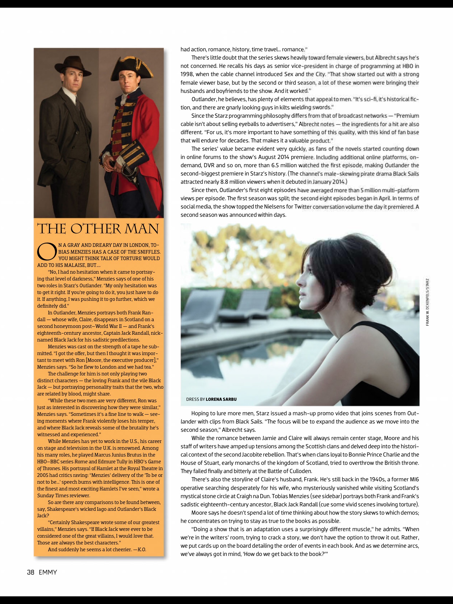 We have seen the first photos and the video of their photoshoot. Now that the Emmy Magazine is on newstands, we are able to share the whole article and the additional photos. Those interviewed include Chris Albrecht (Starz CEO), Ronald D. Moore, Tobias Menzies, Sam Heughan, Caitriona Balfe, and Diana Gabaldon. There is also a “For Your Consideration” packet for the Emmys included in the magazine. There are scans of those at the bottom of the post. No, we do not have a password for you to see all the episodes. Thanks so much to Sherry Troop for sharing!