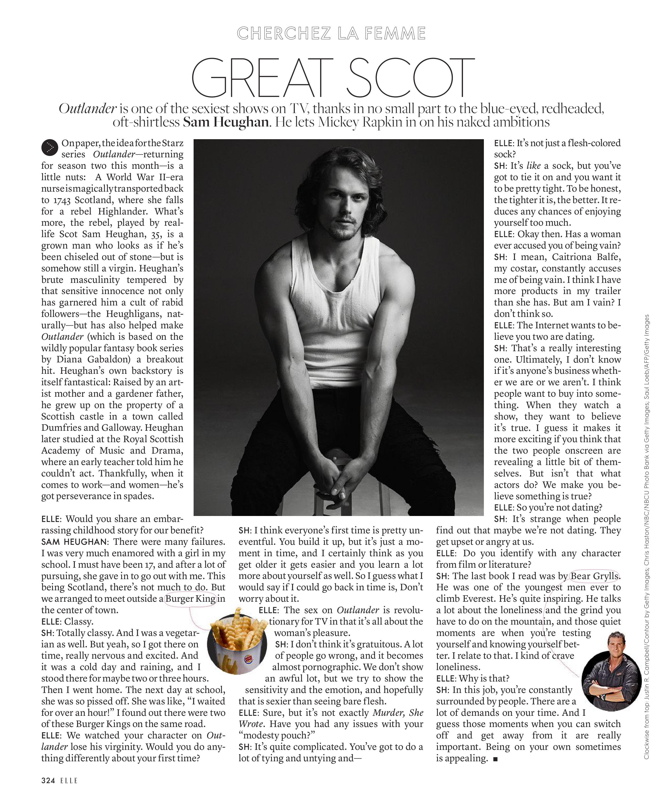 Sam Heughan has a page feature in the latest issue of Elle Magazine (US edition). In the interview, Sam discusses things like dating fiascoes and modesty pouches.