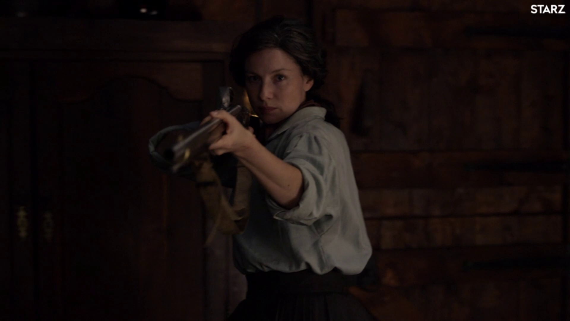 The synopsis: “Claire’s medical expertise proves invaluable for a family of German settlers, but she begins to fear for her life when tragedy strikes her patients’ household. Jamie and Young Ian travel to a nearby town to recruit settlers for Fraser’s Ridge, but find their progress hindered by a burgeoning political movement.”