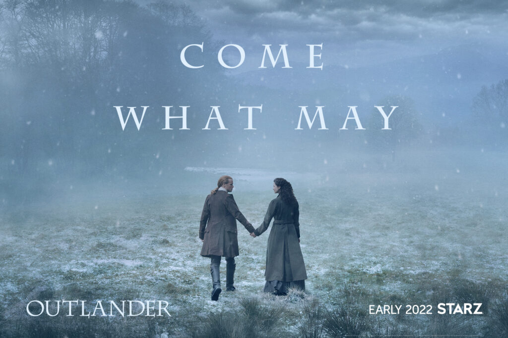 The key art shows Claire (Caitriona Balfe) and Jamie (Sam Heughan) holding hands with their backs turned, faces turned toward each other. They are walking in the grass with a river in the background and a house can be seen faintly in the background on the right. It’s Fraser’s Ridge. The tagline for the key art is “Come What May.” The key art also says “Early 2022,” so there is still no premiere date for season six.