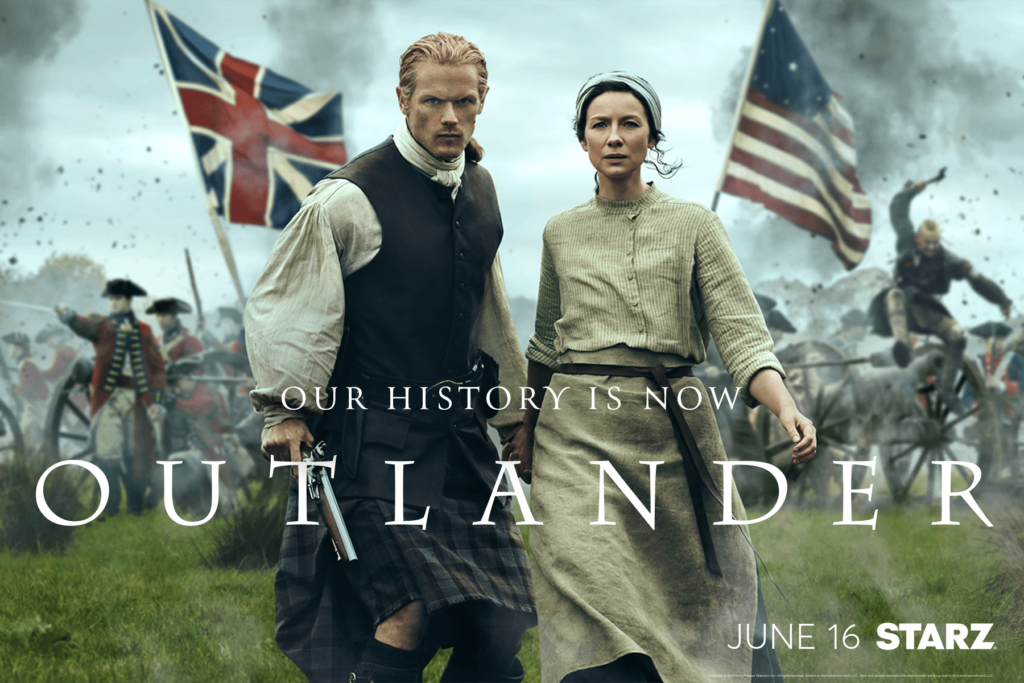 Starz released the new key art for season seven, along with a “living” key art that ends with the still key art. As always, Claire (Catriona Balfe) and Jamie (Sam Heughan) are featured in the key art and are depicted on a battlefield with the English and American flags displayed behind them. The tagline for season seven key art is “Our History Is Now.”