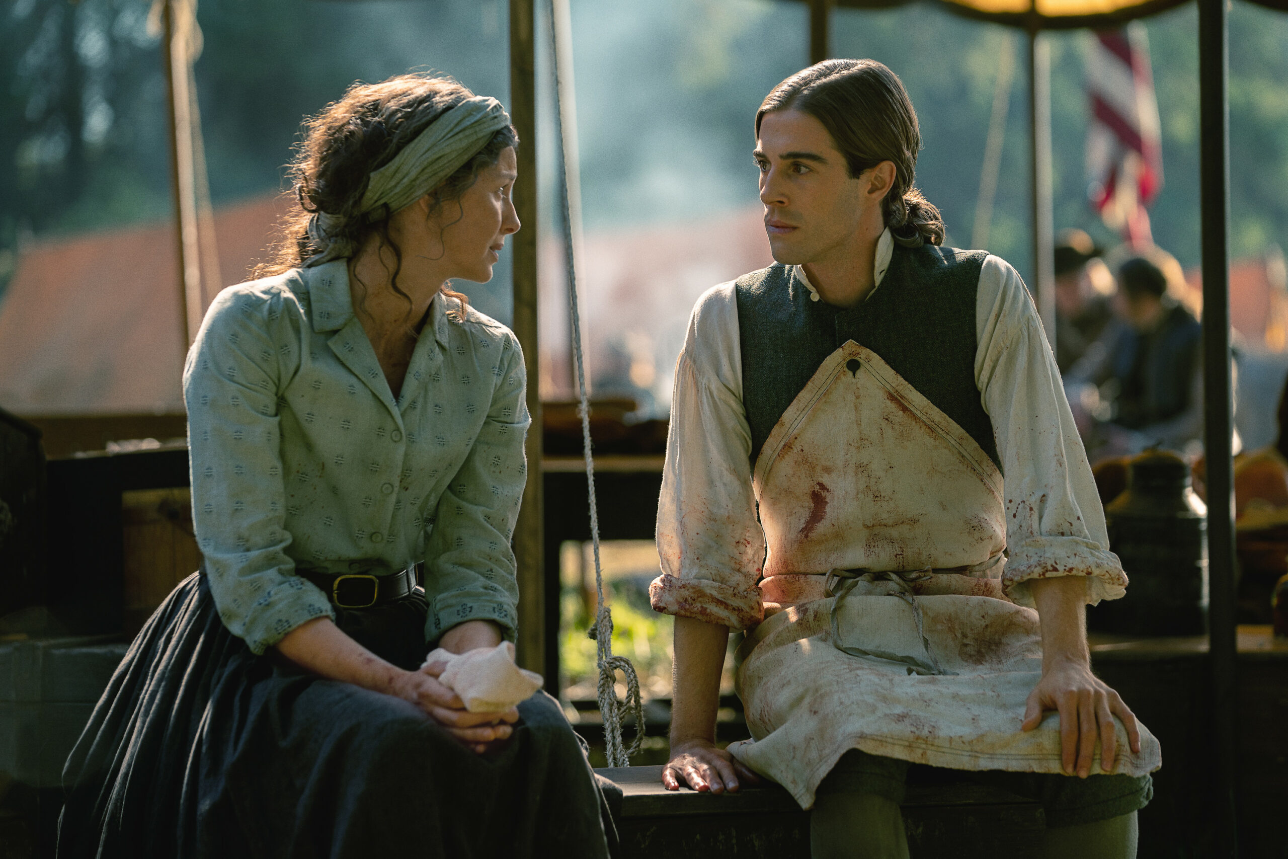 Characters that can be seen in these photos include Jamie (Sam Heughan), Claire (Caitriona Balfe), Brianna (Sophie Skelton), William Ransom (Charles Vandervaart), Roger (Richard Rankin), Ian (John Bell), Denzel Hunter (Joey Phillips), Rachel Hunter (Izzy Meikle-Small), Buck MacKenzie (Diarmaid Murtagh), Arch Bug (Hugh Ross), and Daniel Morgan (Barry O’Connor).