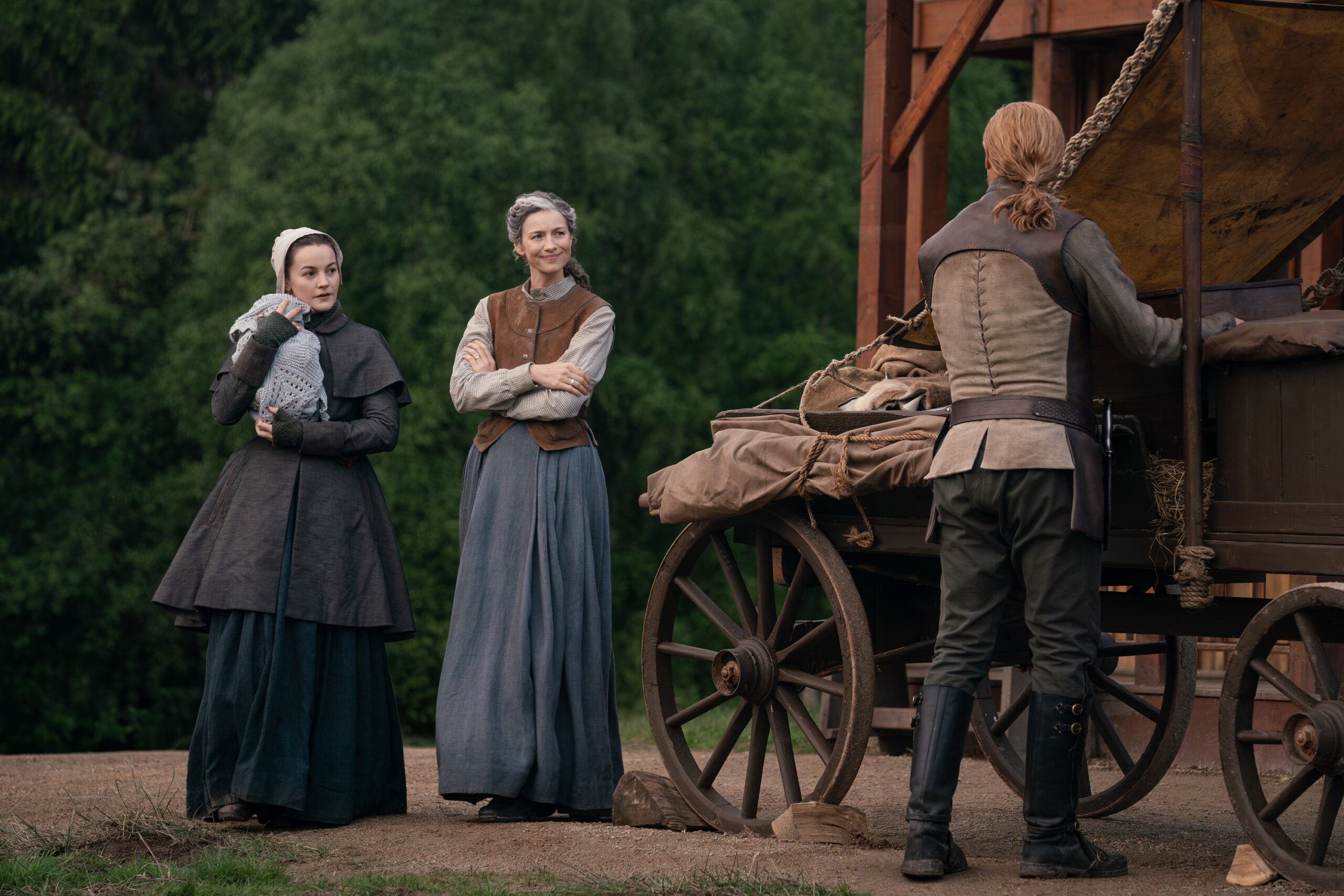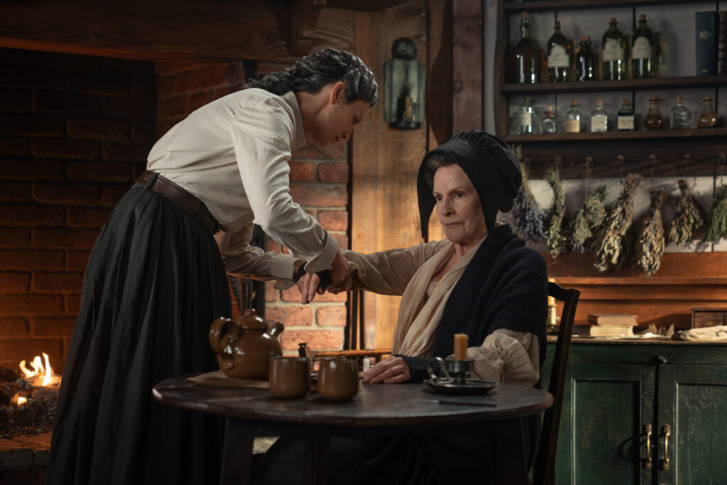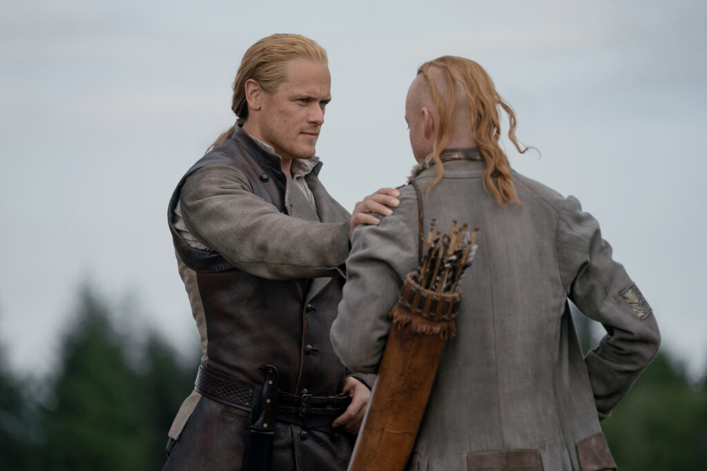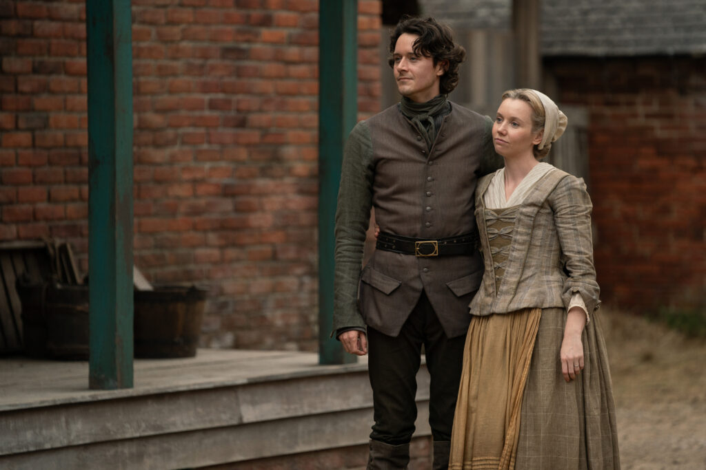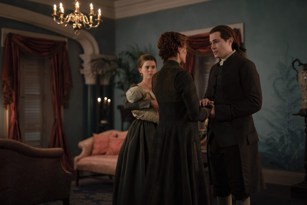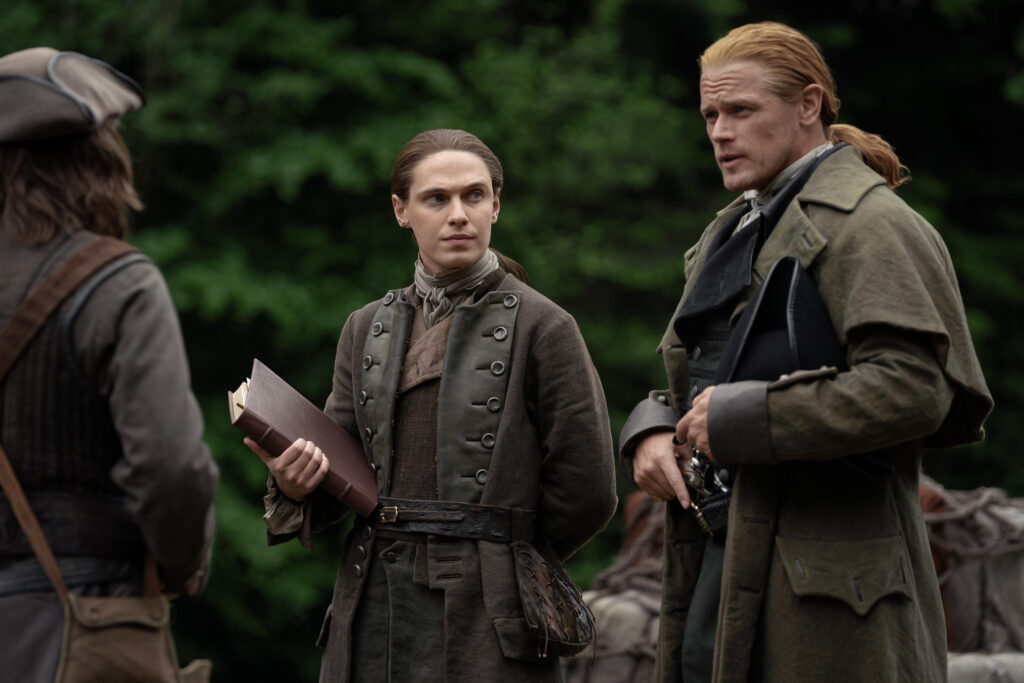 Characters that can be seen in these photos include Jamie (Sam Heughan), Claire (Caitriona Balfe), William (Charles Vandervaart), Lord John Grey (David Berry), Brianna (Sophie Skelton), Roger (Richard Rankin), Captain Cunningham (Kieran Bew), Amaranthus (Carla Woodcock), Marsali (Lauren Lyle), Fergus (César Domboy), Ian (John Bell), Rachel (Izzy Meilke-Small), Lizzie (Caitlin O’Ryan), Josiah/Kezzie Beardsley (Paul Gorman), and Elspeth Cunningham (Frances Tomelty).