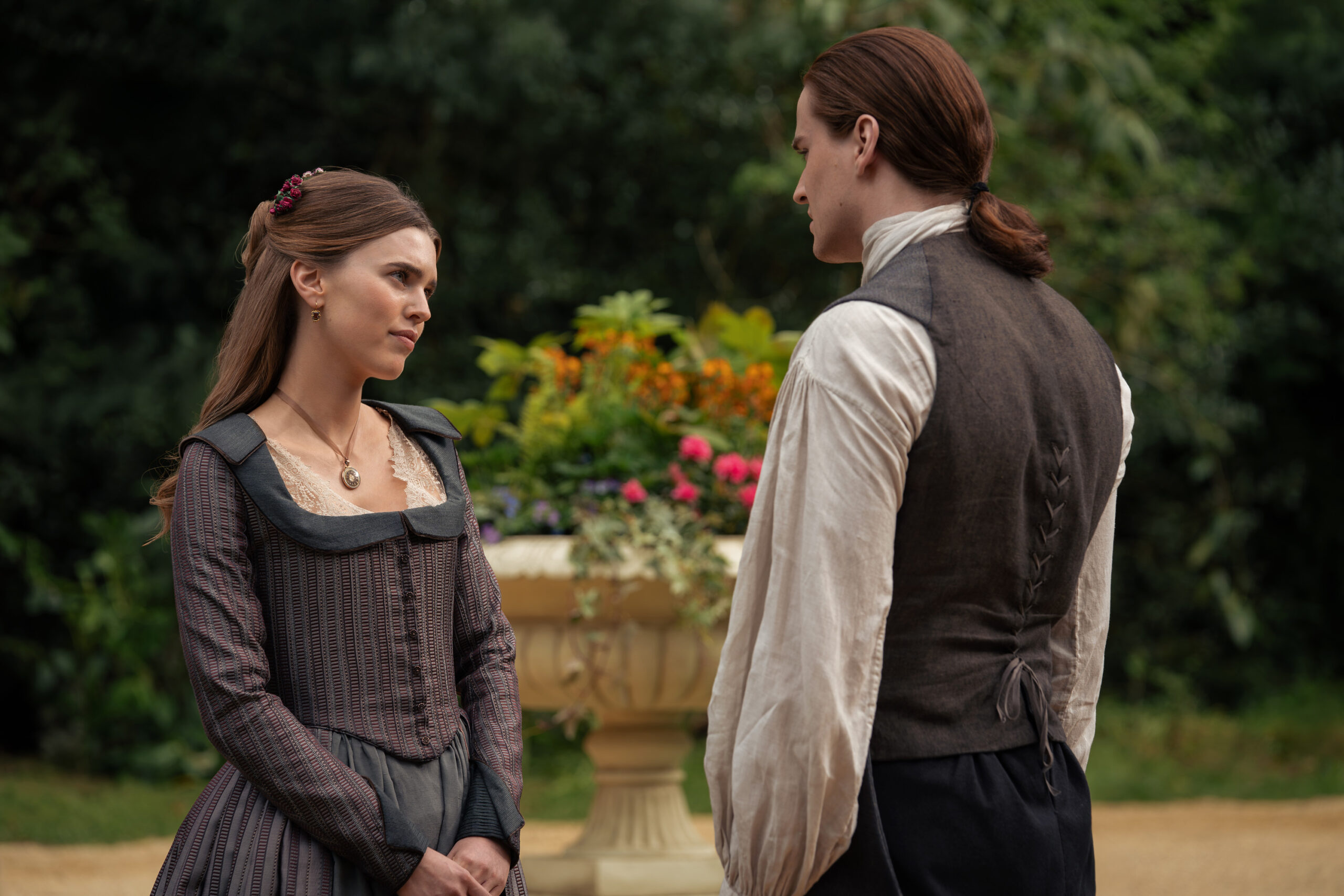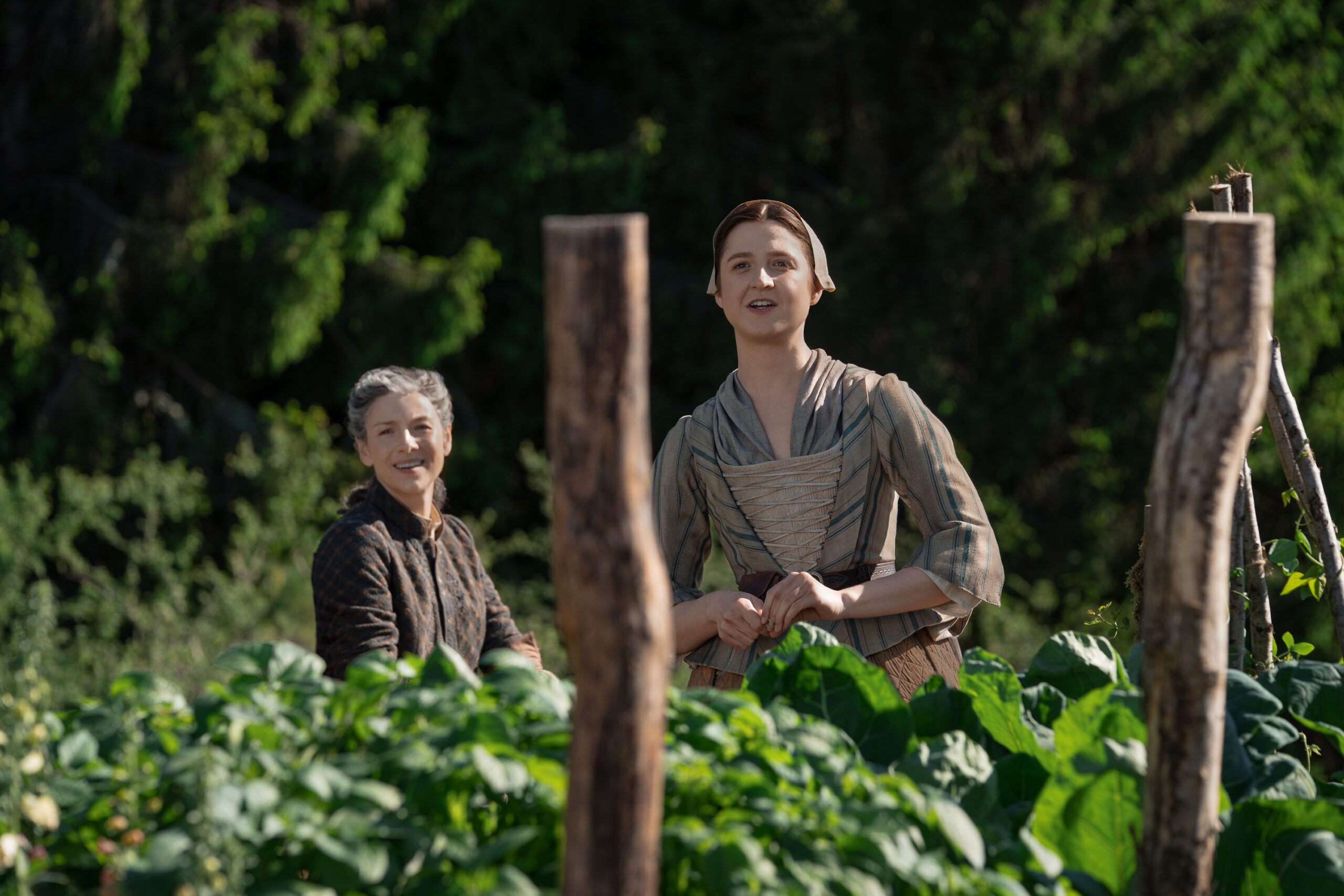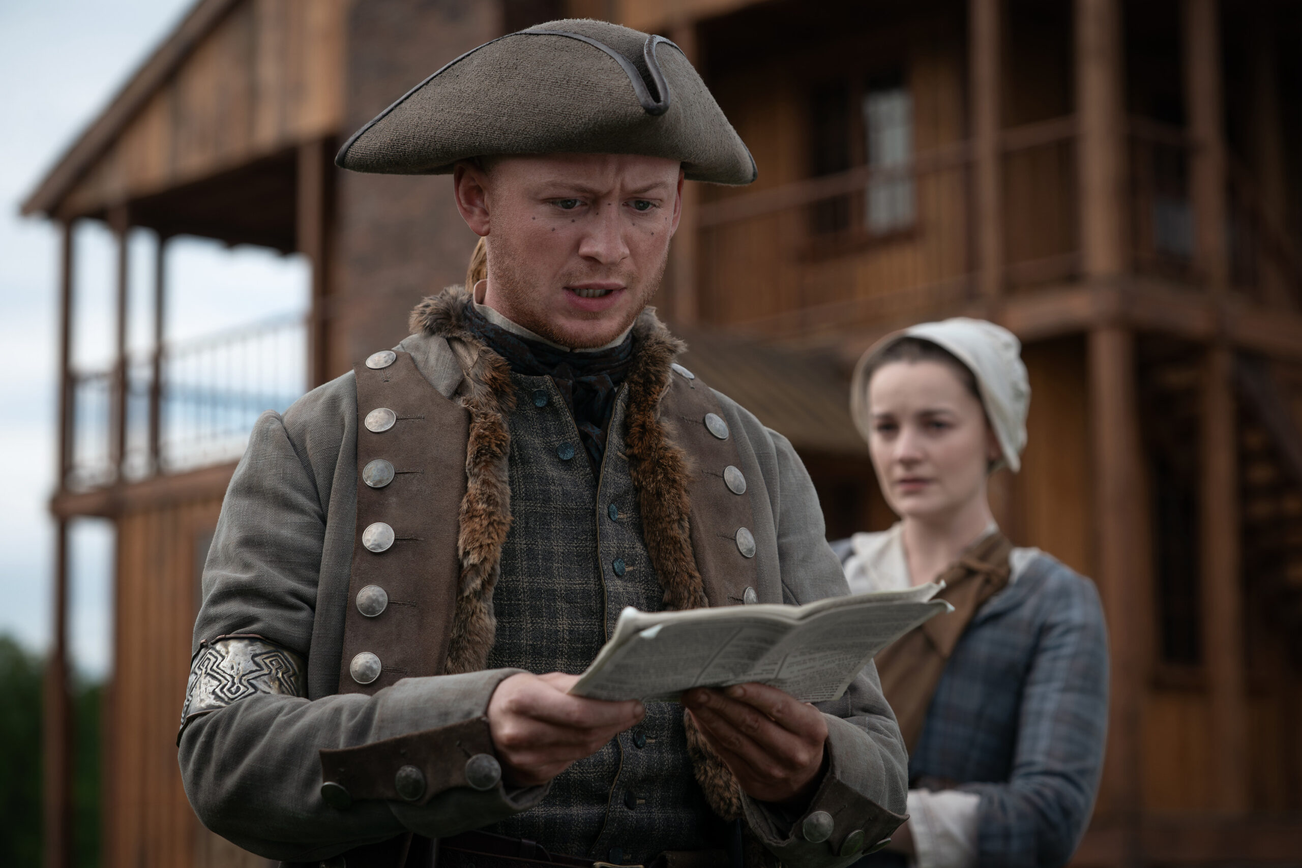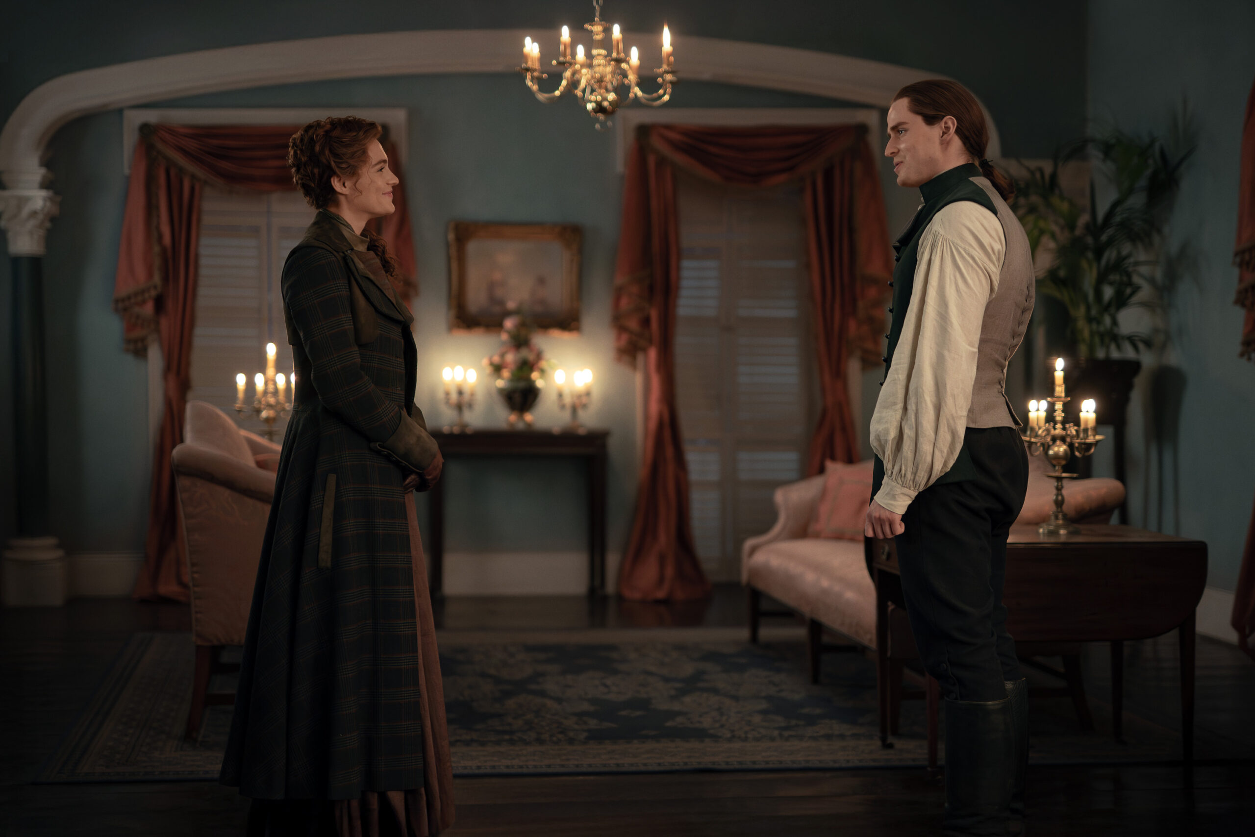 Characters that can be seen in these photos include Jamie (Sam Heughan), Claire (Caitriona Balfe), William (Charles Vandervaart), Lord John Grey (David Berry), Brianna (Sophie Skelton), Roger (Richard Rankin), Captain Cunningham (Kieran Bew), Amaranthus (Carla Woodcock), Marsali (Lauren Lyle), Fergus (César Domboy), Ian (John Bell), Rachel (Izzy Meilke-Small), Lizzie (Caitlin O’Ryan), Josiah/Kezzie Beardsley (Paul Gorman), and Elspeth Cunningham (Frances Tomelty).