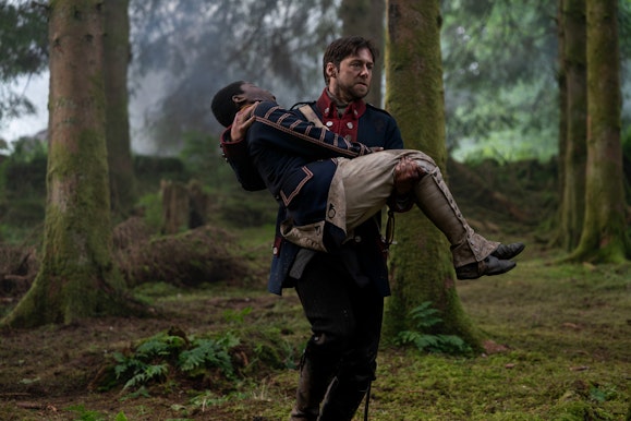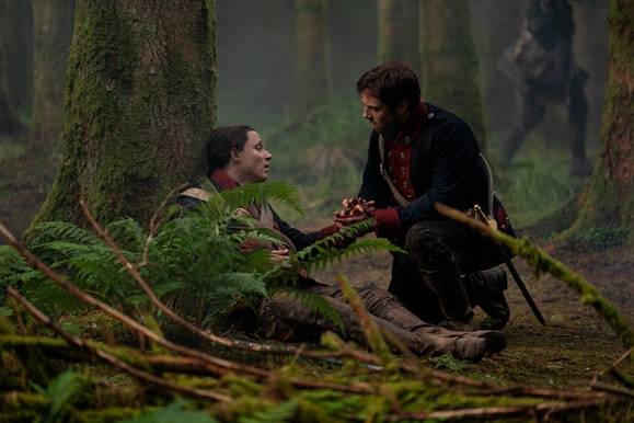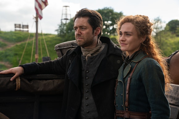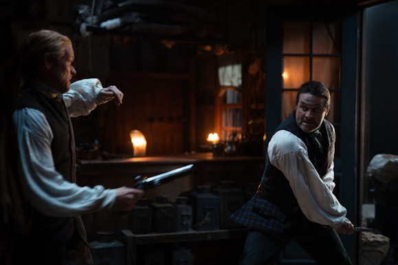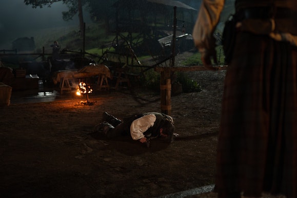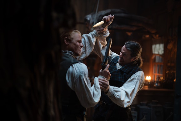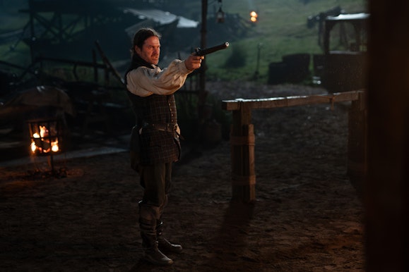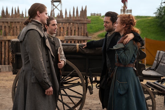 Characters that can be seen in these photos include Jamie (Sam Heughan), Claire (Caitriona Balfe), Brianna (Sophie Skelton), Captain Cunningham (Kieran Bew), Buck (Diarmaid Murtagh), and Hiram Crombie (Antony Byrne).