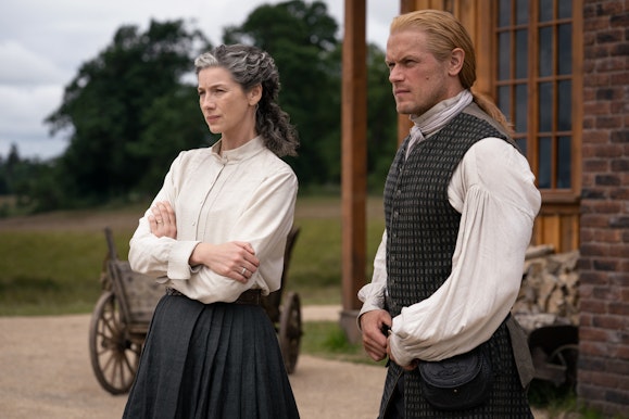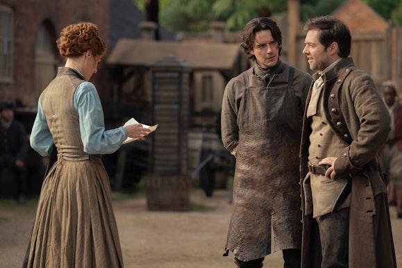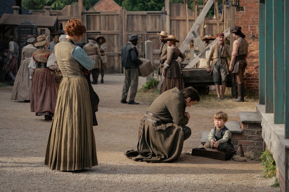 Characters that can be seen in these photos include Jamie (Sam Heughan), Claire (Caitriona Balfe), Brianna (Sophie Skelton), Roger (Richard Rankin), Ian (John Bell), Rachel (Izzy Meikle-Small), Fergus (Cesar Domboy), Elspeth (Frances Tomelty), and Benjamin Moss (Henri-Christian Fraser).
