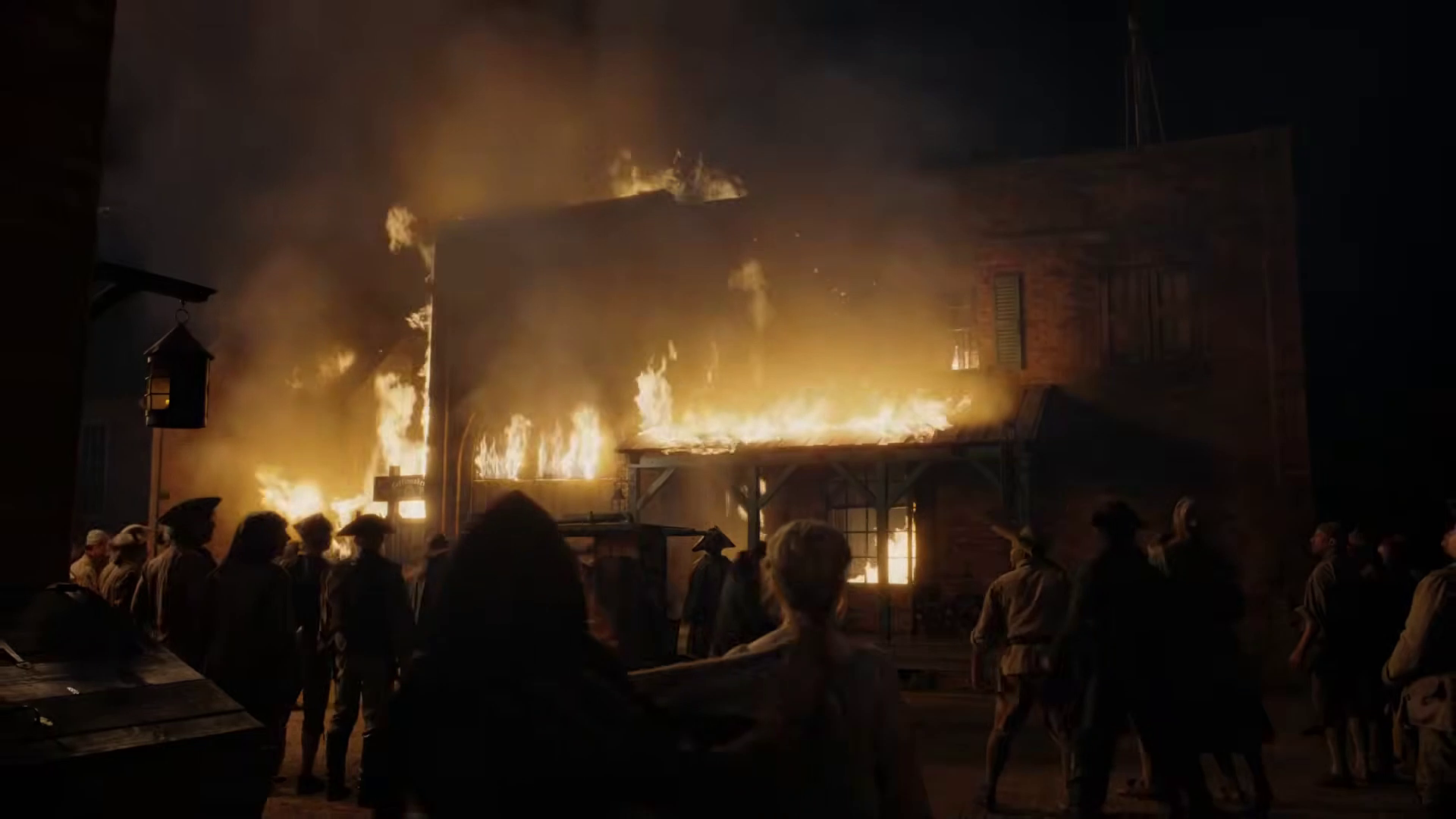 The preview shows Jamie (Sam Heughan) and Claire (Caitriona Balfe) dealing with something at home that appears to involve Fanny (Florrie May Willkinson). In Savannah, there appear to be more political protests being directed at the print shop, including a fire. Lord John (David Berry) is dealing with something on the home front as well with Amaranthus (Carla Woodcock) and William (Charles Vandervaart).