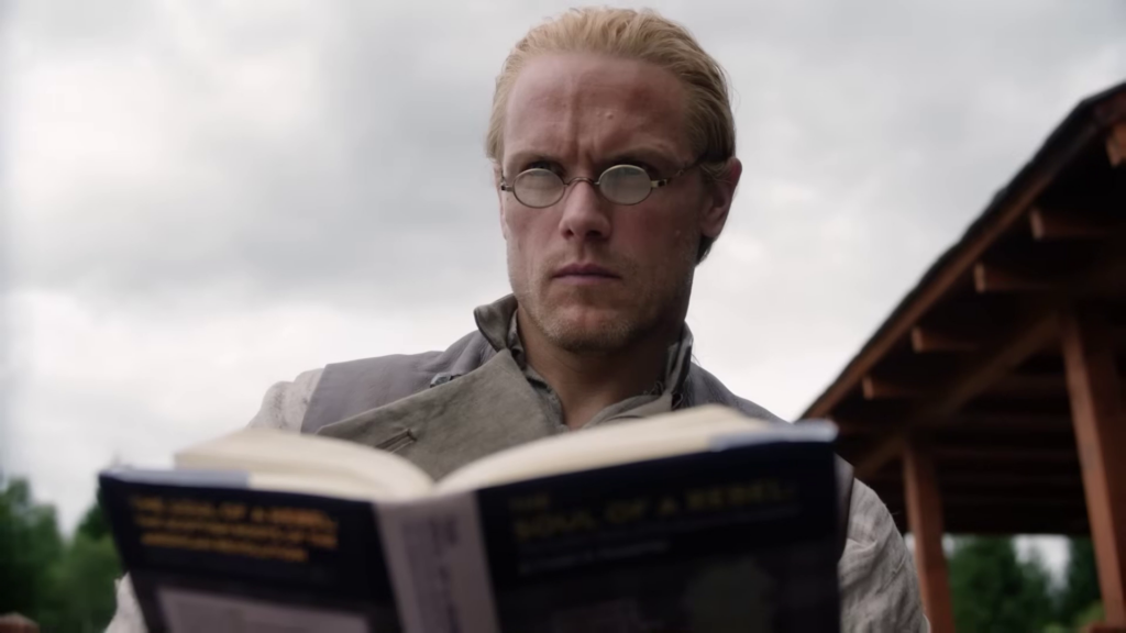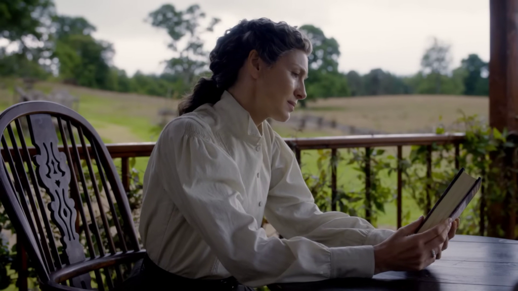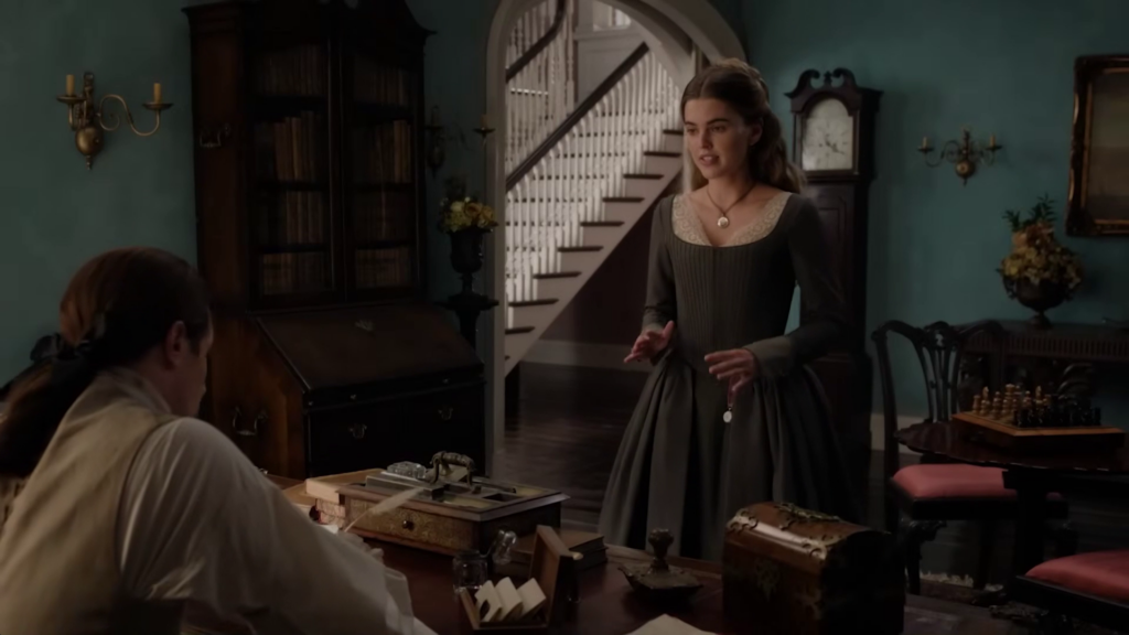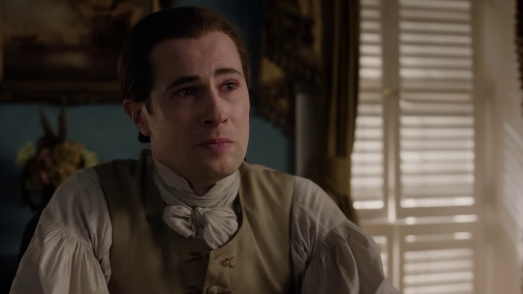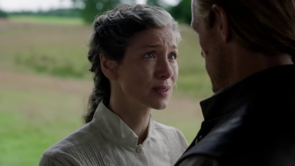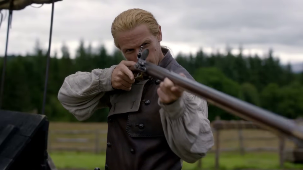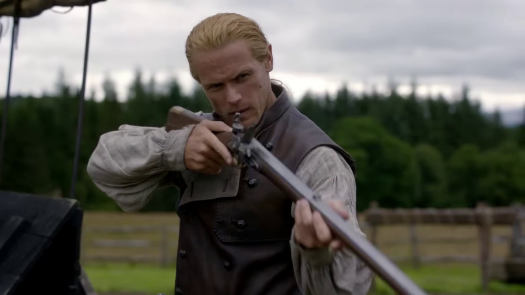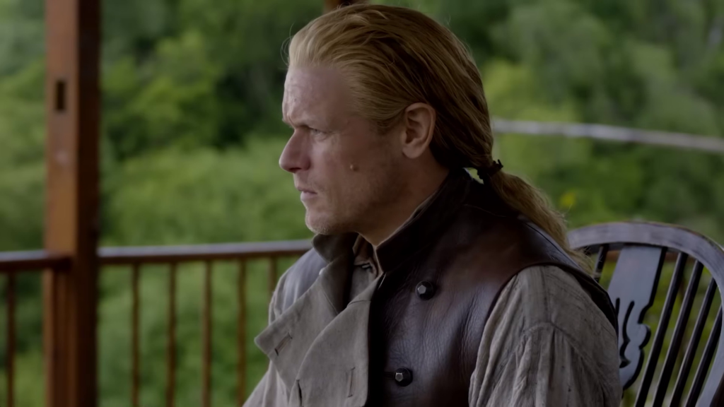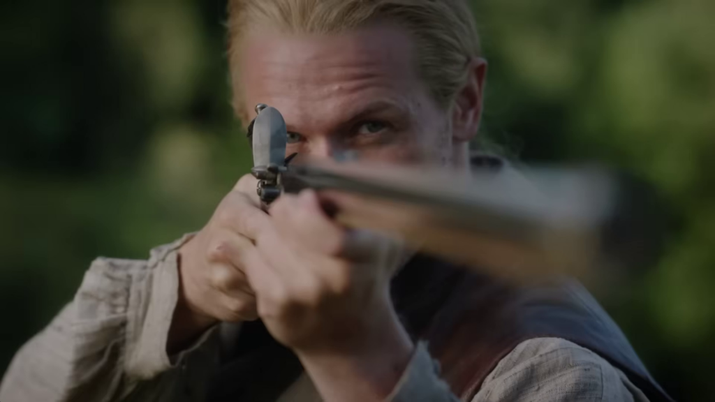 The preview shows Jamie (Sam Heughan) and Claire (Caitriona Balfe) continuing their discussion of Frank’s book. William (Charles Vandervaart) is seen in the forest–could he be heading to the Ridge? Lord John (David Berry) has a pistol pulled on him. Jamie and the men on the Ridge begin preparing for battle and recruiting new men.
