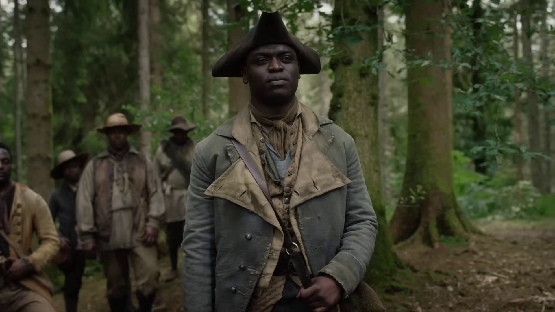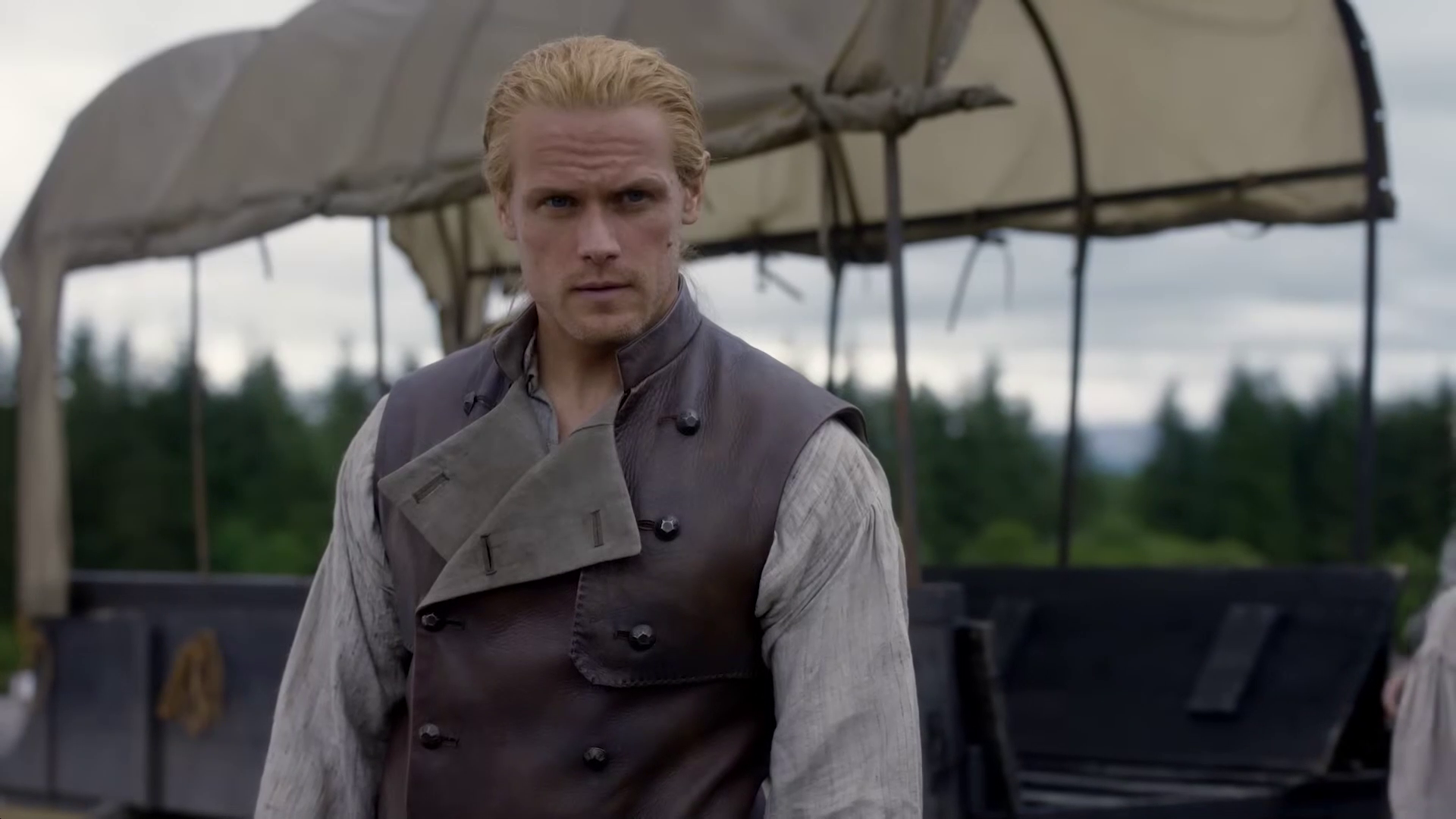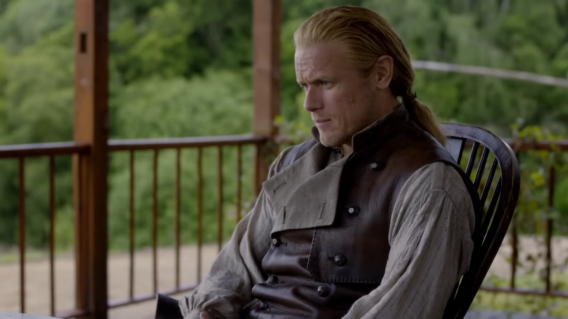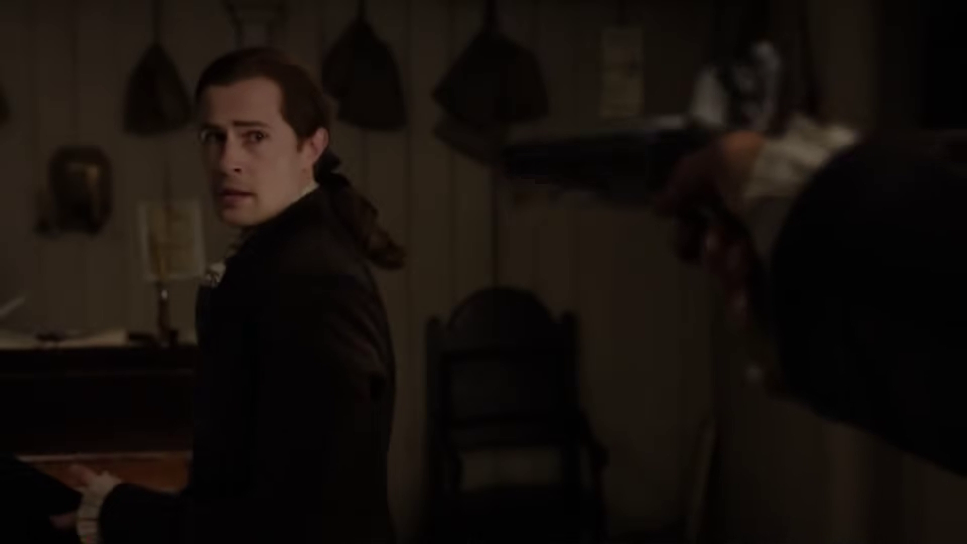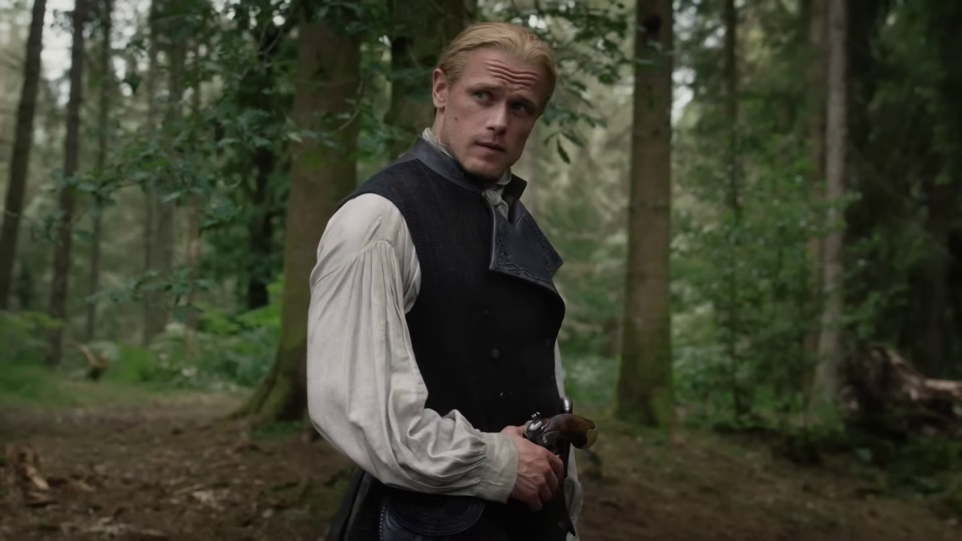 The preview shows Jamie (Sam Heughan) and Claire (Caitriona Balfe) continuing their discussion of Frank’s book. William (Charles Vandervaart) is seen in the forest–could he be heading to the Ridge? Lord John (David Berry) has a pistol pulled on him. Jamie and the men on the Ridge begin preparing for battle and recruiting new men.